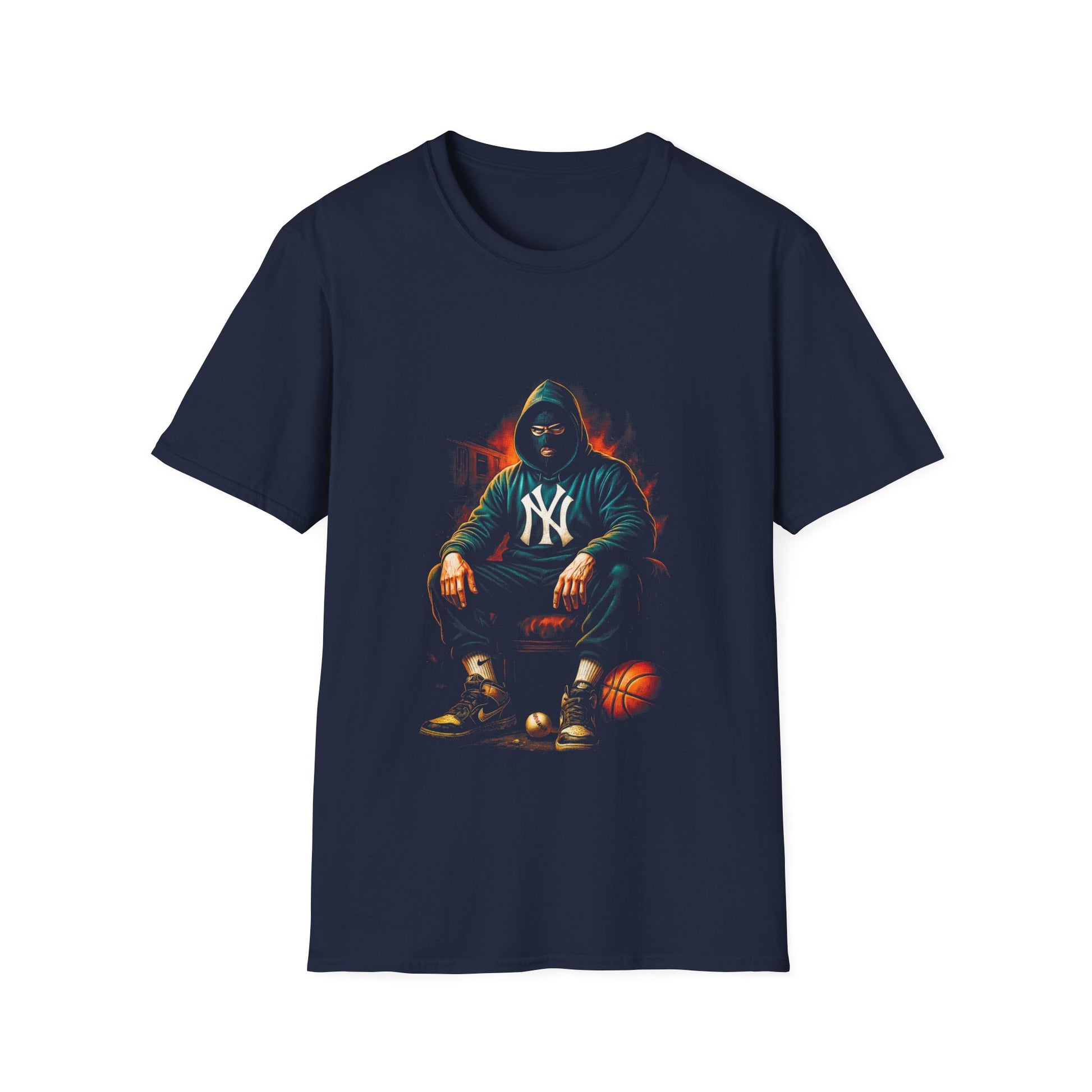 A bold, streetwise tee that channels late-night court energy and city grit. The black crew shirt features a vivid, high-contrast print of a hooded player sitting with a basketball — neon highlights and ember-like tones give the image a cinematic, urban edge. Lightweight and breathable, the tee layers easily under a jacket or wears solo when you want the art to speak loud. It settles into your rotation as the go-to for game nights, pickup runs, or when you want to project quiet confidence on city streets.